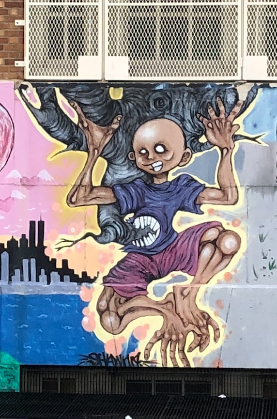 Back in October 2018, I was wandering the streets of Long Island City, Queens, and came across a mural on display at William Cullen Bryant High School. For the most part, the mural was composed of friendly images and uplifting messages to inspire the students…but then there was that one freaky-looking figure.